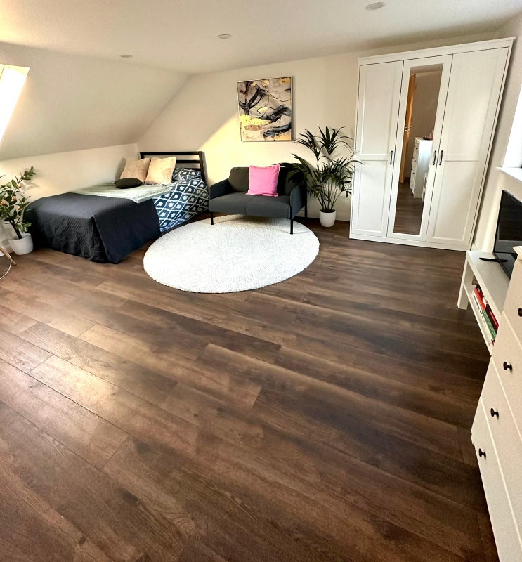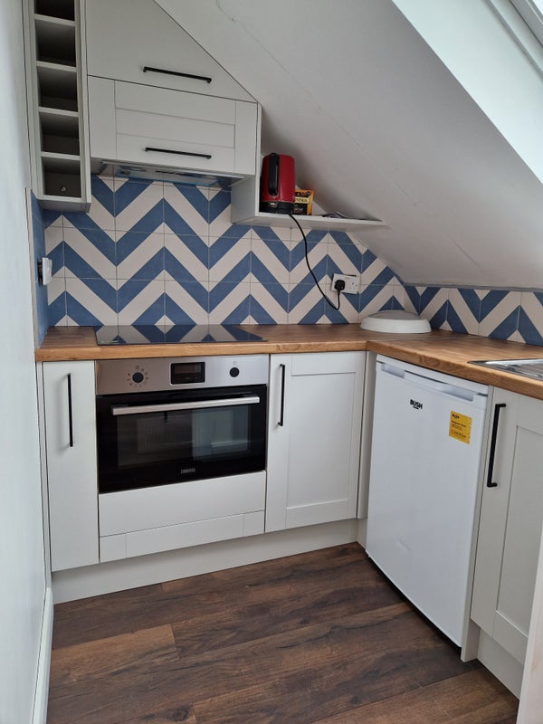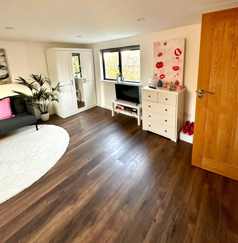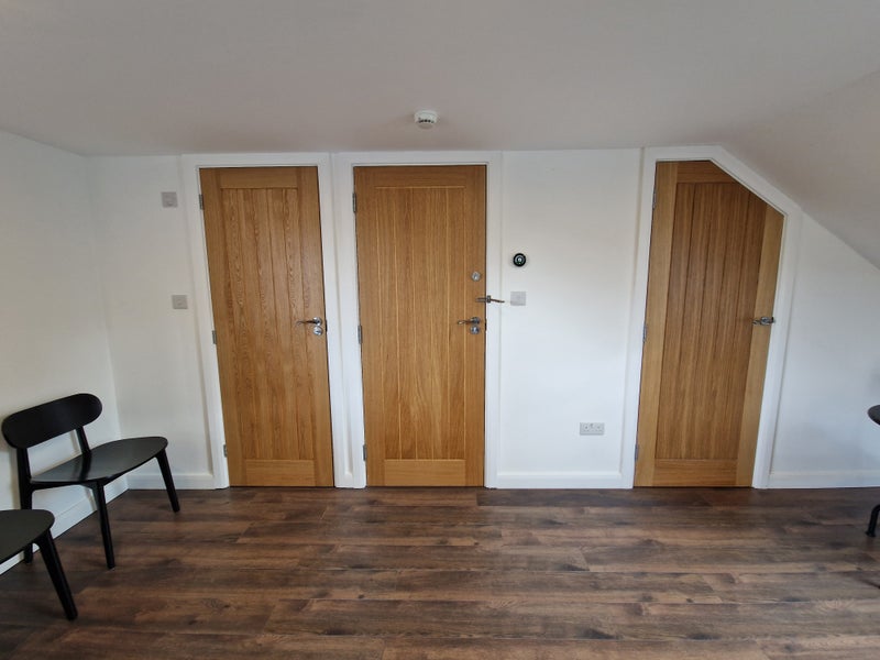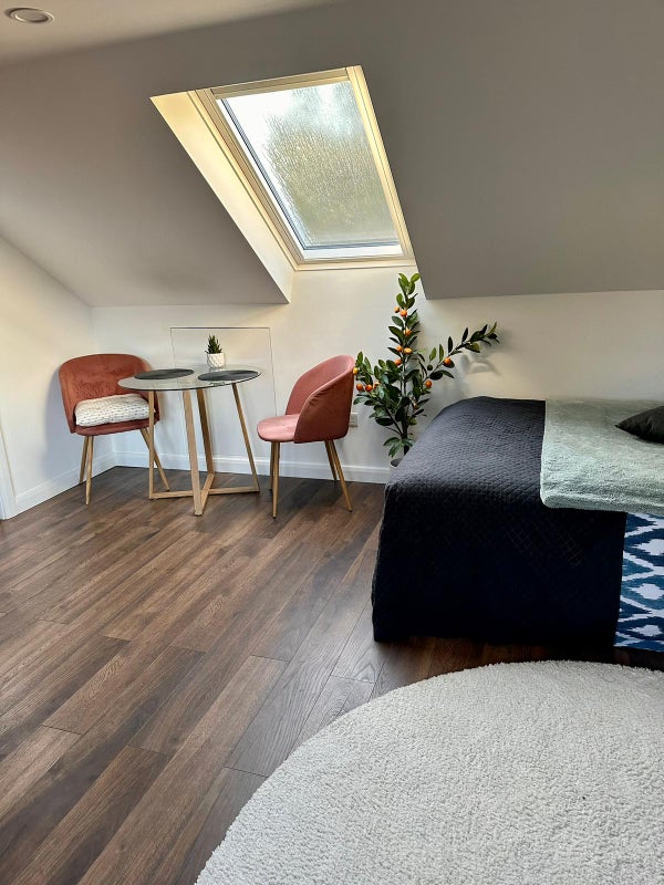 Studio in the loft with a fully equipped separate kitchen and ensuite bathroom. The studio is furnished with: a double bed, wardrobe, chest of drawers, sofa, TV and TV stand, dining table and chairs. Also, there is a massive storage space under the eaves. Size of the studio 6.4mx5m. The studio is on the top floor of HMO house. Access is through the house.