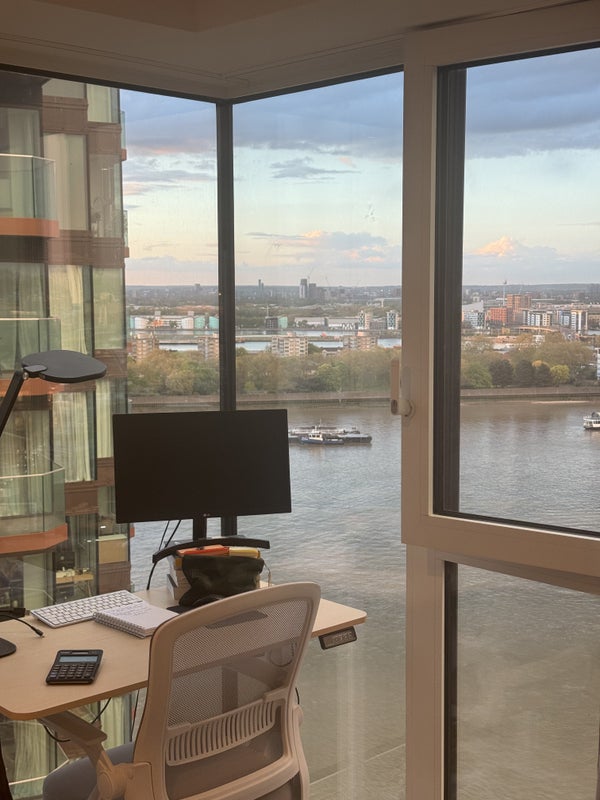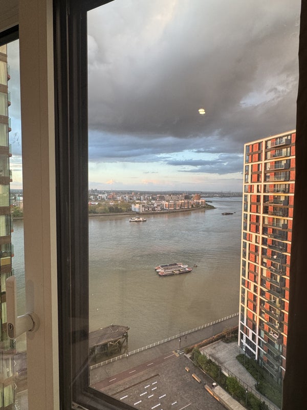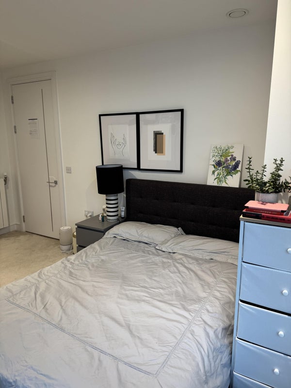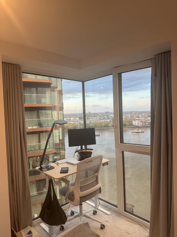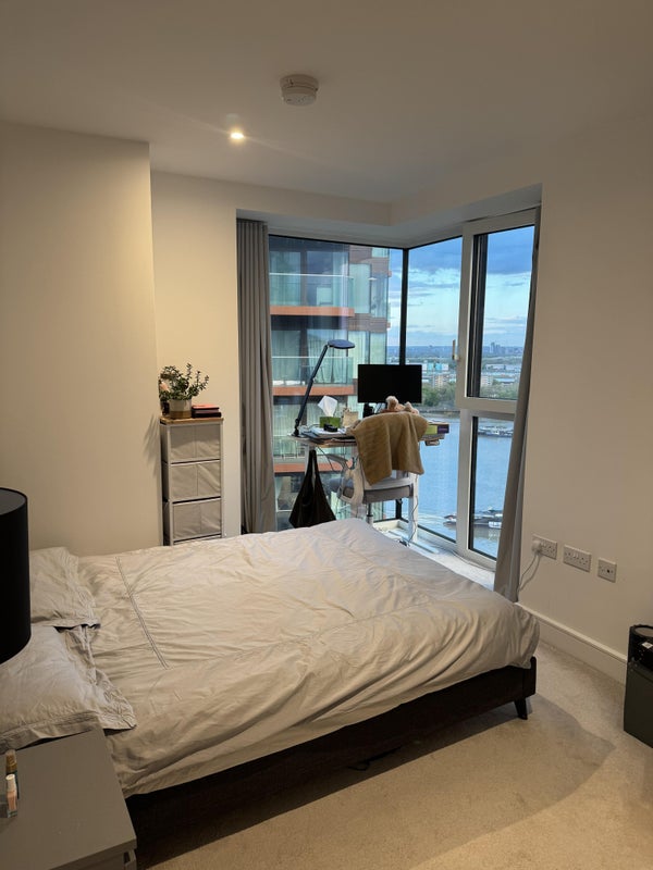 A bright and cosy room is available in a modern flat with a beautiful view of the Thames.