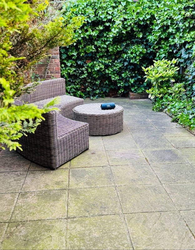 There is a fully equipped kitchen with storage space, and a small garden with a seating area—perfect for relaxing.