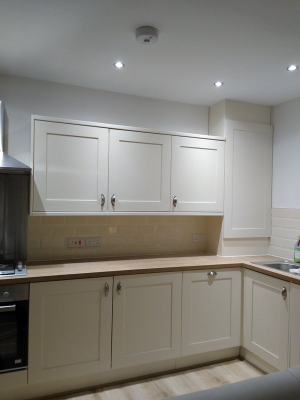 Shared open plan kitchen/living room with integrated appliances including washing machine and dishwasher.