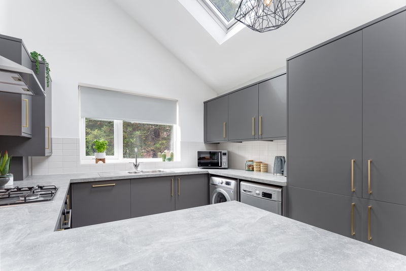 We've created a large kitchen and a seating area with a large flat screen Smart TV. The back door opens from the kitchen to a rear yard with casual seating to enjoy the lovely weather (whenever that arrives this year!).