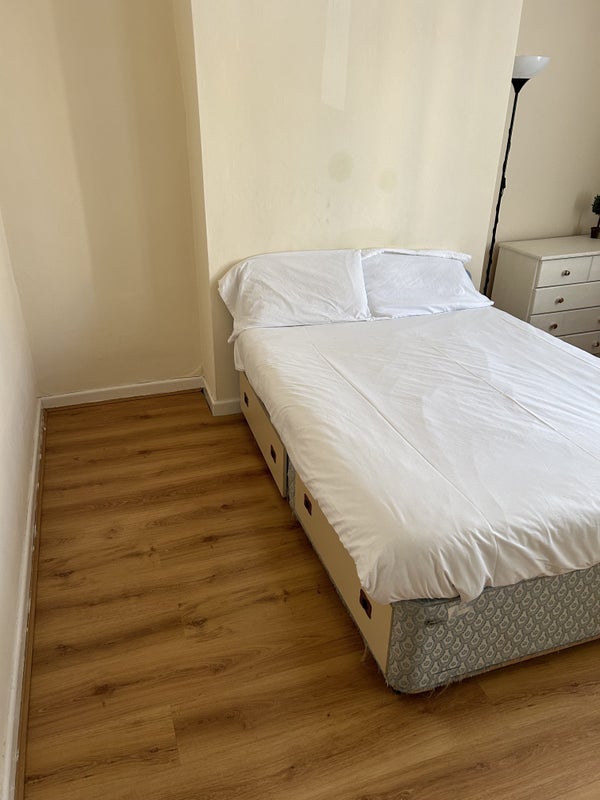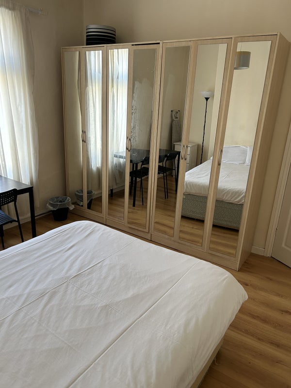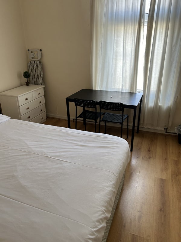 Spacious double room available with a double bed, one wardrobe and a table and chairs for a single occupant.