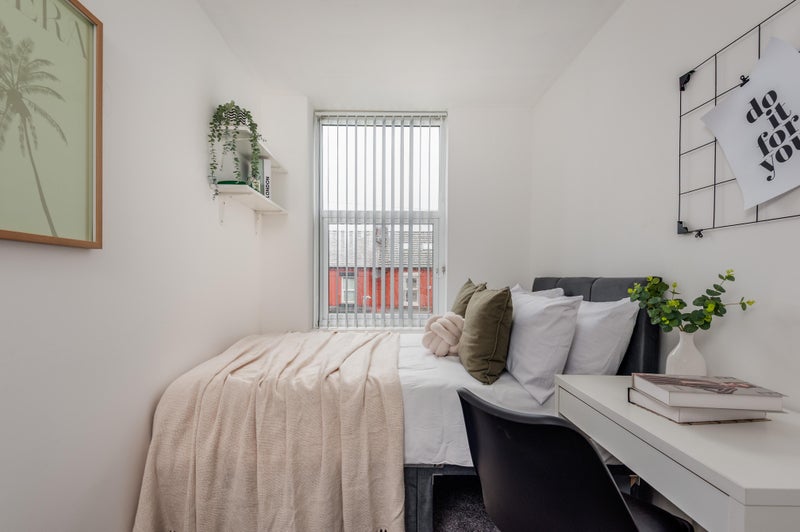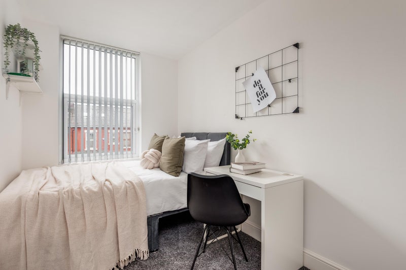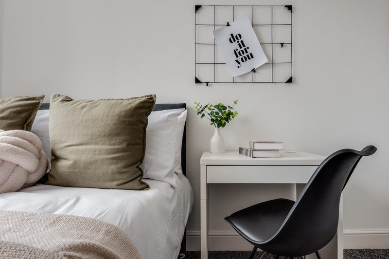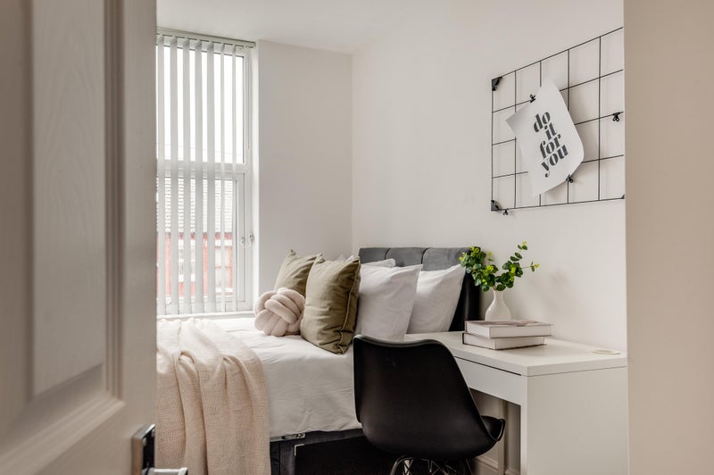 Your bedroom features a double bed, wardrobe, desk and chair. Both bathrooms are super spacious with electric showers. There is even a cleaner that comes every other month for all communal areas!