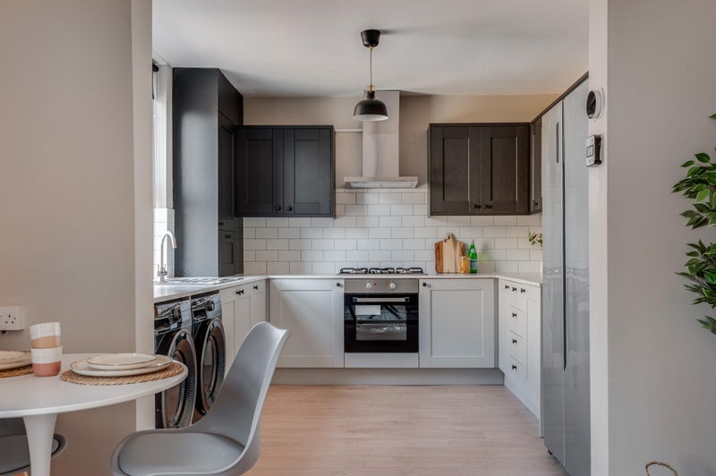 The open plan kitchen and living room are fully kitted out with everything you could need! There are two sofas, a dining table and chairs. There is also a wall mounted smart TV, perfect for relaxing after a long day at work. The kitchen has loads of storage as well as a washing machine, tumble dryer and huge American fridge freezer!