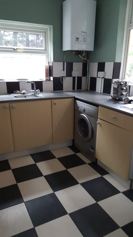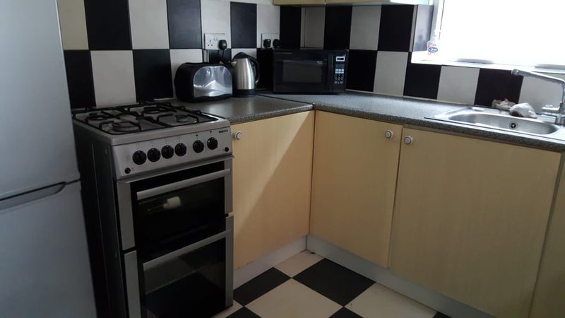 Kitchen: Kettle, toaster, microwave, oven, washing machine.
