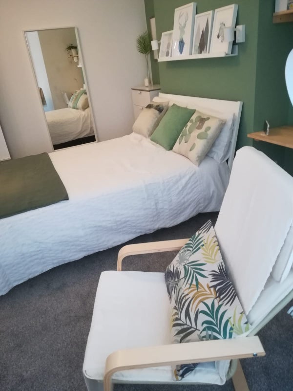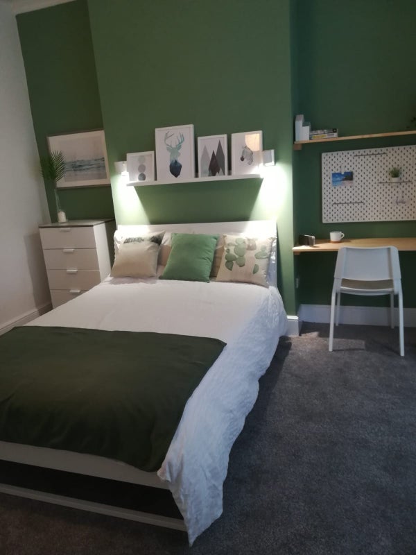 Room 1 - Large double, bay window, 425 per month. Deposit 425. Double bed, double wardrobe and chest of drawers. Desk.