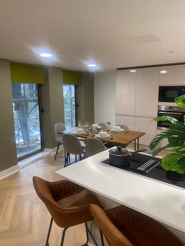 All studios are built with comfort in mind, fully furnished double bed side tables and double wardrobe, desk/workstation, ensuite bathroom and fitted kitchen with Microwave, Oven and a two-pan hob.