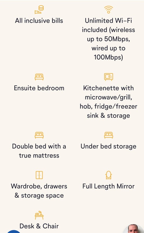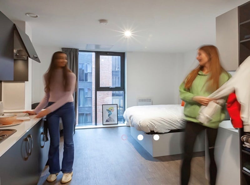 Studio includes kitchen, double bed with under bed storage, desk and wardrobe.