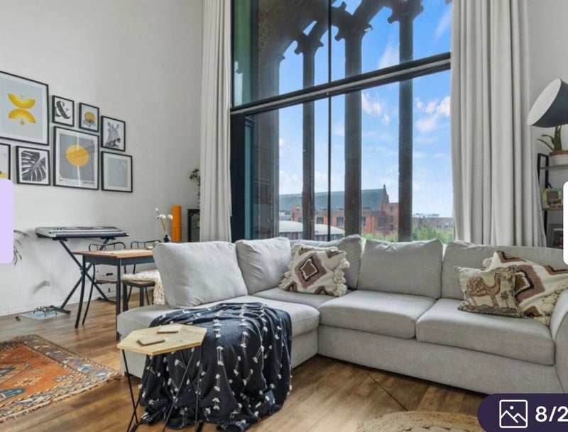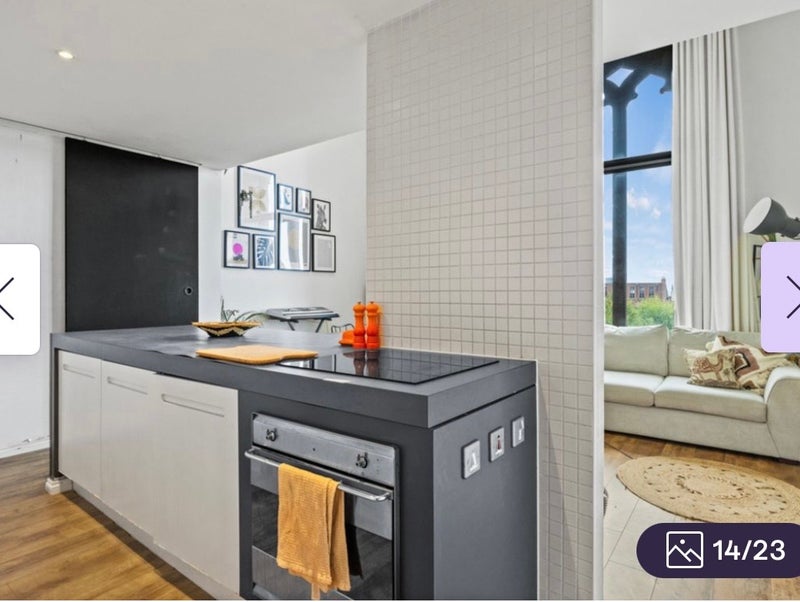 The apartment features a spacious open-plan living and kitchen area with large windows that flood the space with natural light and offer stunning views across the city. The property blends contemporary living with original architectural charm, making it a really special place to live.