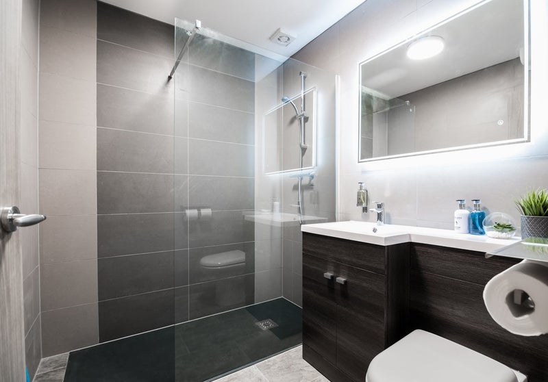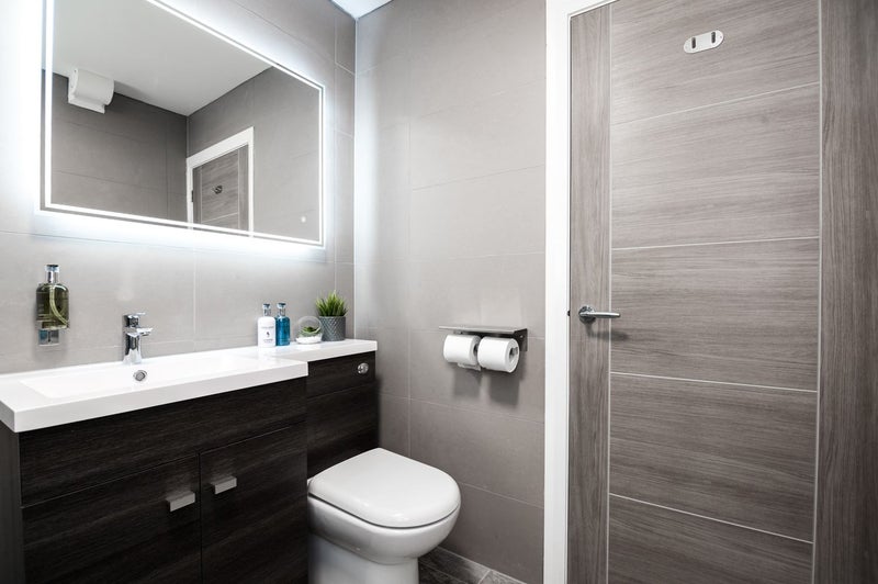 > En-suite bathroom; walk-in shower, vanity unit, electric led mirror, sink, toilet