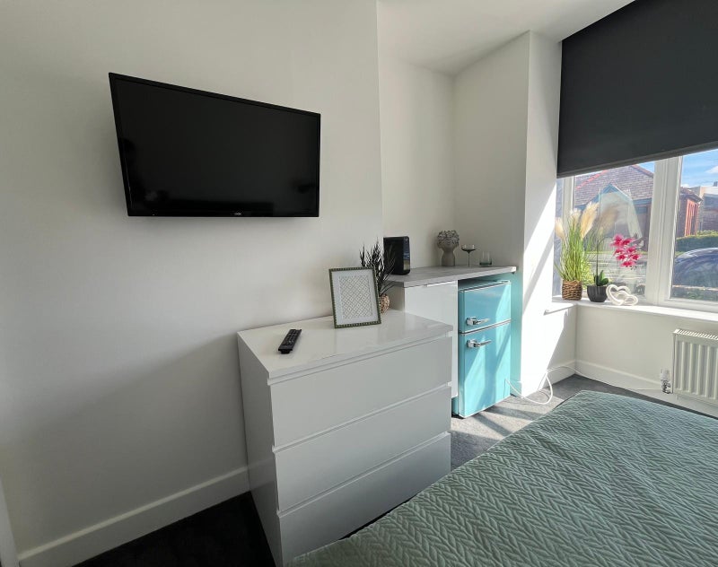 The room is fully furnished, featuring a private en-suite bathroom, along with a TV and personal fridge, large mirrored wardrobe and more.
