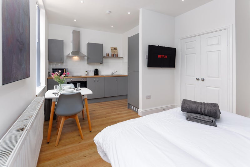 A bright and well-designed self-contained studio located on the first floor of a beautiful Victorian property on a quiet residential road in Wallasey, just minutes from the Seacombe Promenade and nearby parks.