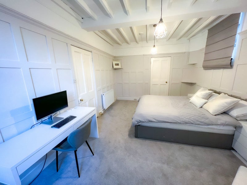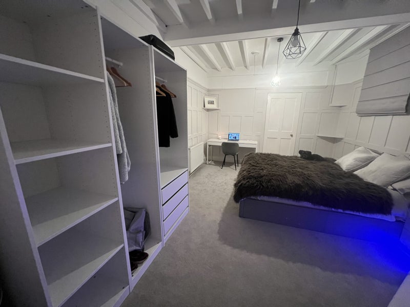 The bedroom is rather big & has its own private box room, they are furnished with a queen bed and new mattress, a desk and chair, 3x wardrobe unit, bedside table, box storage unit, sofa, coffee table and large TV. I am also happy for any changes of layout between these two rooms, i. e. box room as a lounge, office room, or walk-in wardrobe style to suit preferences