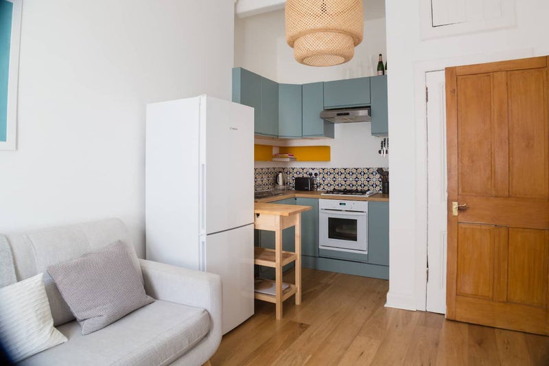 Open plan kitchen and living room. Living space comprised of 3 seater sofa, window seat, book shelves, coffee table, dining table and bench. Kitchen is fully kitted out with all utensils and equipment including; microwave, kettle, toaster, fridge-freezer, gas hob, electric oven, ironing board, iron, vacuum cleaner and washer dryer. There is a large amount of storage space in the kitchen.