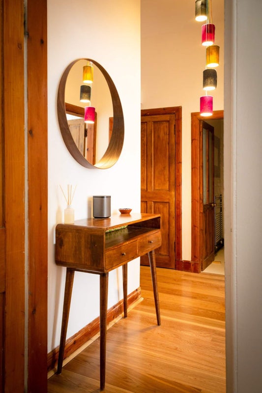 Large hallway with console table, mirror and large storage cupboard.