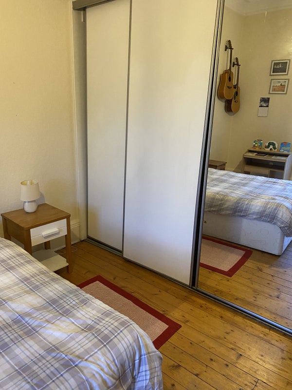 A Furnished double bedroom in a 2 bed flat in Morningside. Equipped with double bed, bedside tables, large fitted wardrobe, desk and chest of drawers.
