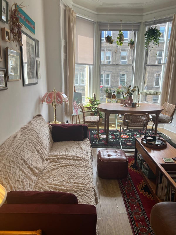 It's a beautiful, homey 2-bed flat with a shared bathroom and a diva of a ginger cat <3 I'm originally from the States but have been in Edinburgh for 4 years! I've put a lot of love into the flat and would love a flatmate who also cares about creating a comfy home environment and feels excited to add their personal touches to our shared space! Love hosting a monthly dinner party and excited for future housemates + friends to be involved!