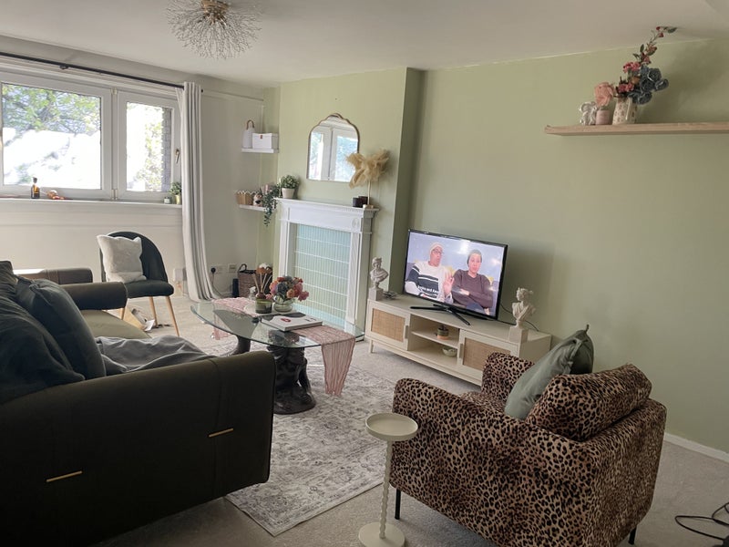 The flat is 3 bedrooms but you’ll be sharing with me only. With shared bathroom with bathtub, Kitchen and living room. Some of the photos are outdated as I paint a lot