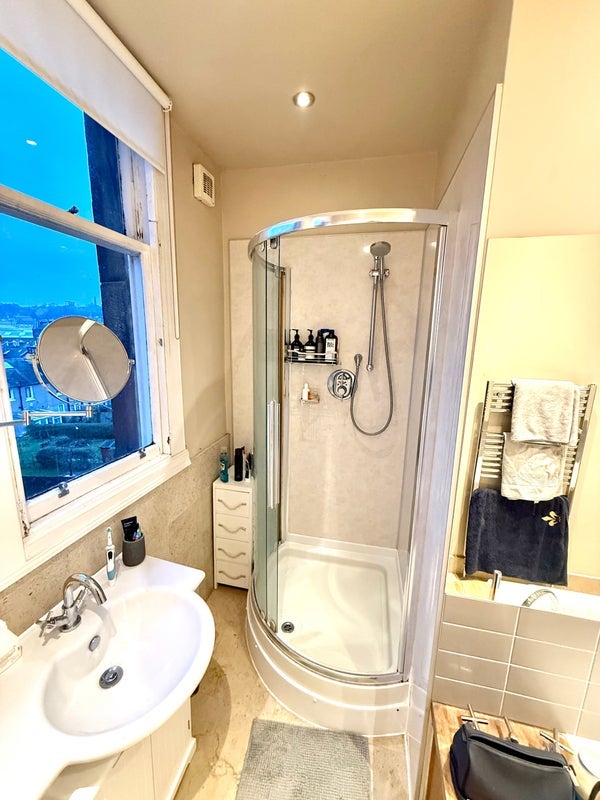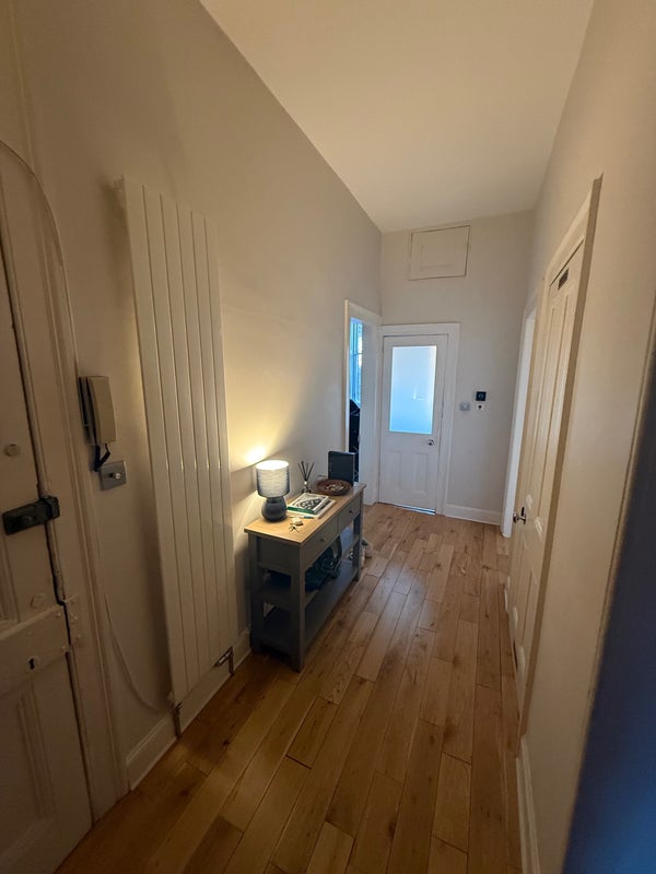 Room available in two bedroom flat, with king size bed, desk, drawers, and small walk-in wardrobe. Flat is fully furnished with everything you’d need. Underfloor heating in the bathroom, which has separate shower and bath.