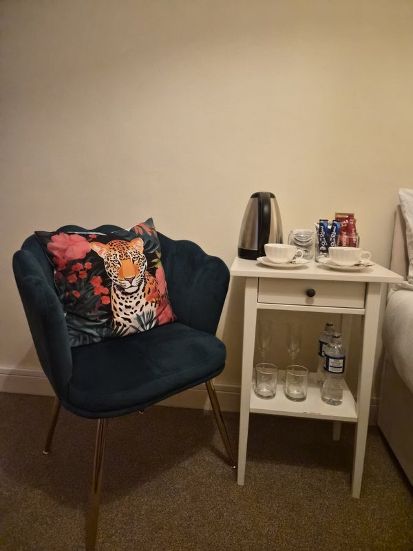 The private room consists of: a double bed, two bedside tables, armchair, wardrobe with hangers and built-in chest of drawers, and an additional free standing chest of drawers, TV with complimentary Netflix, table lamp, small mirror. A small desk/table will also be added to the room soon.