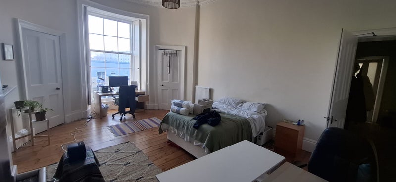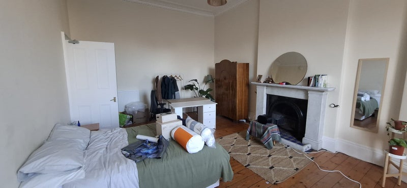 Hello! Our housemate is moving out and we need a new person to move in! We are all friendly and sociable. We enjoy going on walks, going to the pub together and hanging out in the lounge with a coffee on sunday mornings. The flat is absolutely stunning - big rooms and windows, wooden floors and a decorative ceiling in the lounge. The flat also has lots of storage and this bedroom in particular is massive so ample space if you have lots of stuff. Let us know if you are interested! Looking forward to meeting you :)