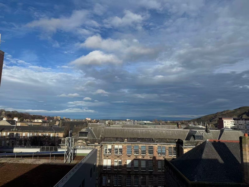 The flat is located on the too floor of the building, and it does not share a wall with any other rooms. It is super warm and cozy, with access to spacious kitchen and a private building top terrace with direct views of Arthur’s Seat. It is also very quiet, since it shares no wall with other rooms and is not facing the street. The laundry room is directly downstairs. I think it may be the best flat in entire O’ Shea!