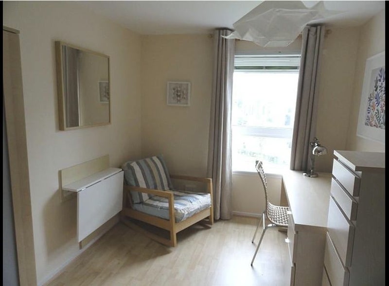 The room includes a 4ft (small double) bed, a large desk and chair, a large easy chair, laminate floors, IKEA furniture, plenty of storage and a fold-out dining table with a dining area. It is a well-shaped 12 sq metres.