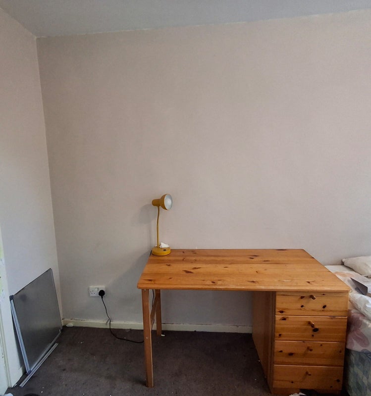 I'm a PhD student at the University of Edinburgh looking to find a flatmate for a first-floor flat . The room comes furnished with a double bed, a shelf and a desk, and contains adequate wardrobe space as well.