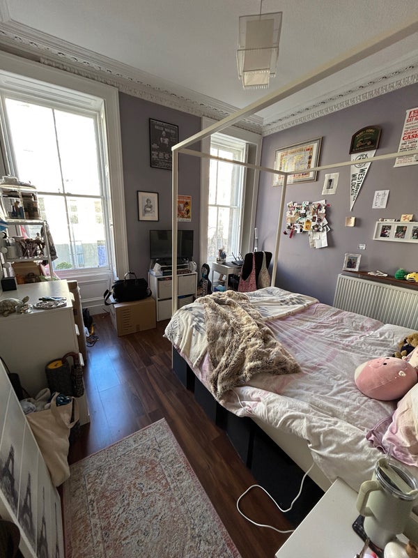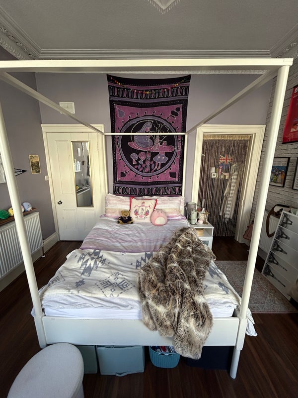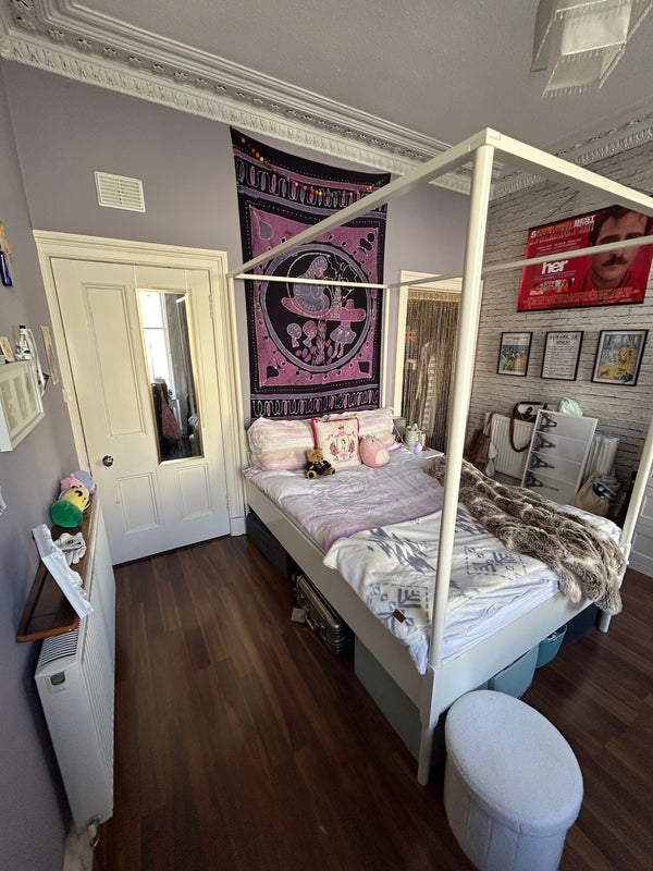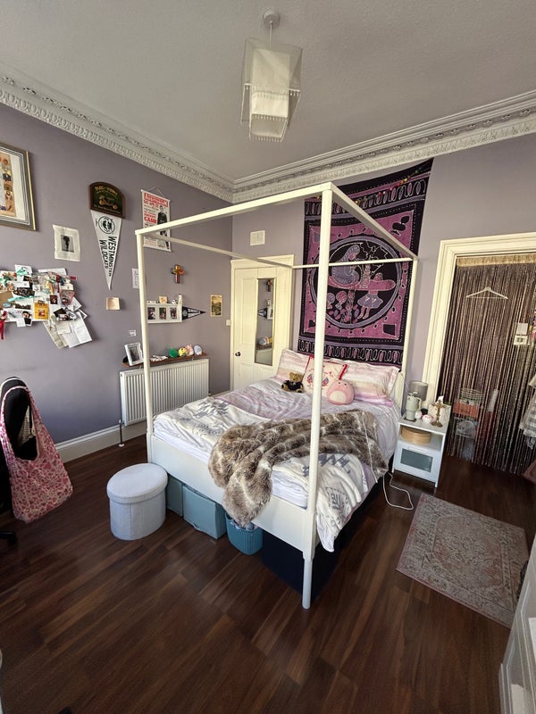 Spacious double bedroom available to rent from the 21st of April! 10-minute walk to George Square along the top of the Meadows. Right below Lothian Street with easy access to Princes Street and New Town. Tall ceilings, big windows, four poster bed, small walk-in closet. Shared bathroom, laundry room, living room, and kitchen. Easy access 1st floor flat. Shared backyard garden space for the building.