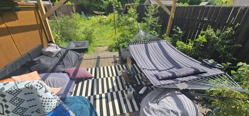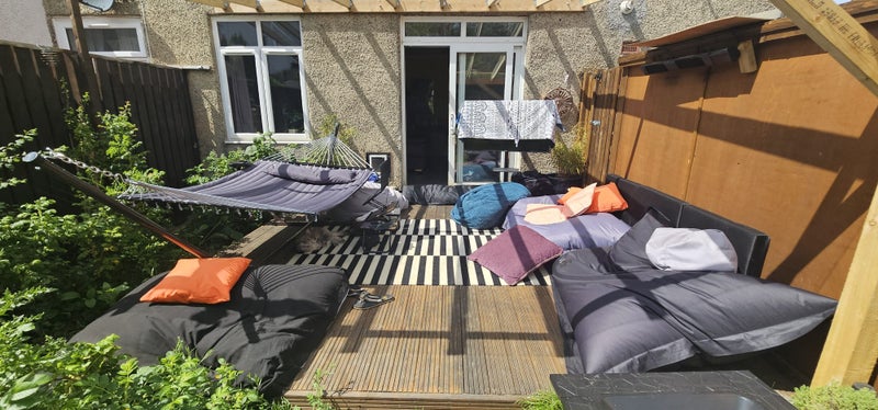 The flat: Two front gardens and a large back garden with BBQ and tables for summer gatherings. All appliances are recent - boiler (2020), fridge, microwave, ceramic hob, oven, 9kg washer, 9kg dryer. Bathroom has just been fully redone.