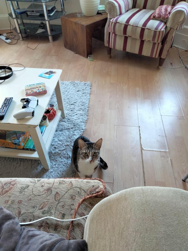 The staying housemate is a female young professional with a cat, working from home most days.