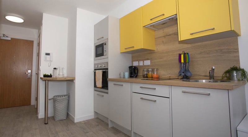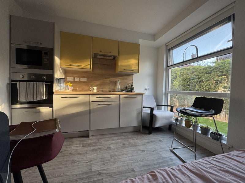 Studio has: WiFi included, large smart TV (HDMI adaptor included), study desk, private bathroom, private kitchen containing fridge/freezer, oven, microwave and cooking hobs.