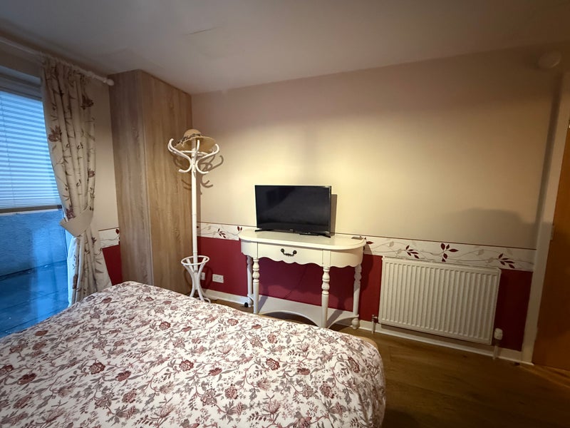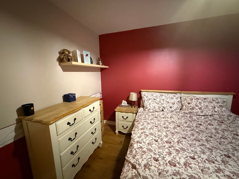 I am letting a bright and spacious ensuite double room. The room is fully furnished with a king-size bed and a high-quality mattress, a bedside table, chest of drawers, a console with TV, a bookcase and a large built-in wardrobe.