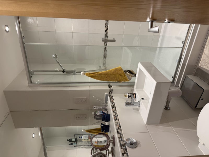 The ensuite bathroom has a shower, large wall mirror and shelves.