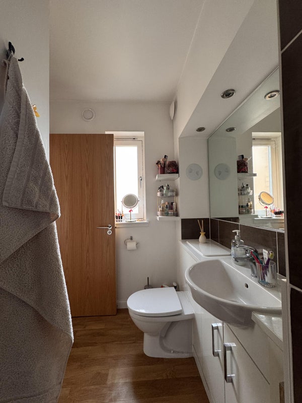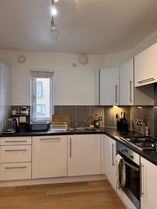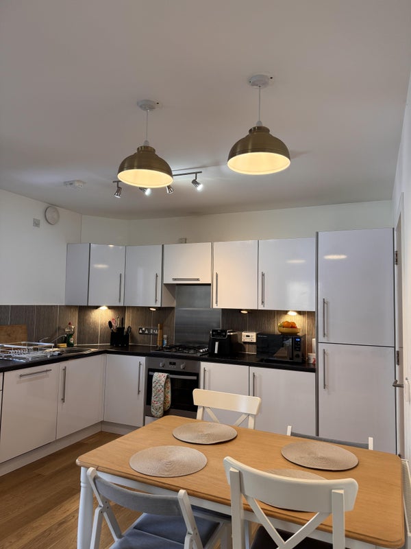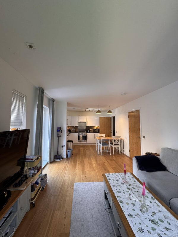 The flat is a modern 2-bed, 2-bath first-floor apartment in a quiet residential area. It was built in 2016, so it’s well-insulated with a good EPC rating.