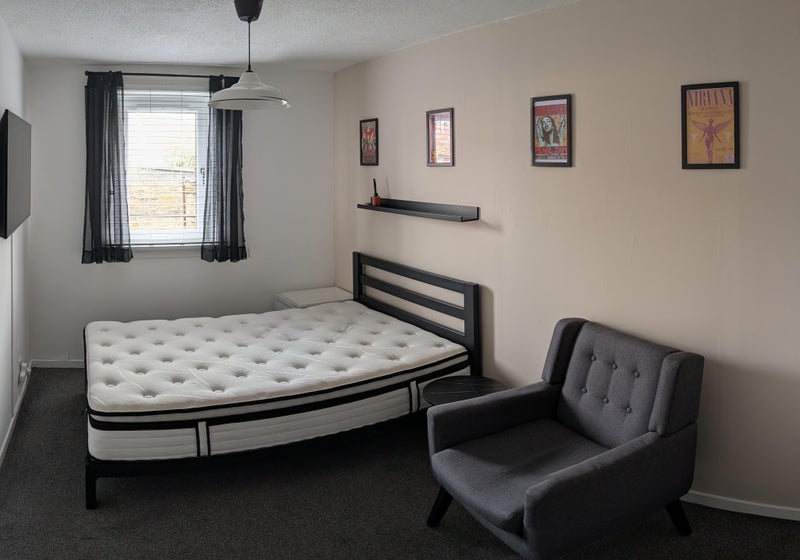 Large size bedroom with double bed, wardrobe, tv and chair. All new. The room has a key door lock. All bills included.