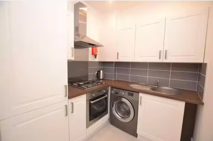 A small kitchen with cutlery and modern appliances. Please note that there is no Microwave.