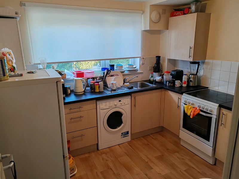 The living room and kitchen are shared with the current flatmate, maintaining a clean and comfortable space for all.