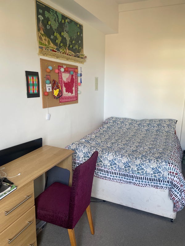 Furnished room with double bed, personal shower and sink , desk and wardrobe and large living space.