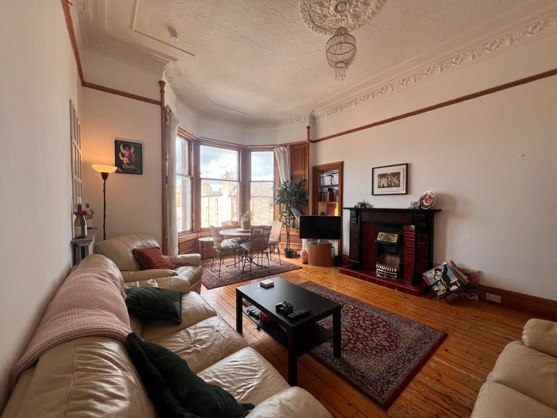 The flat itself has a lovely living room with an original fireplace, high ceilings and bay windows looking on to the Firth of Forth. There is one bathroom, kitchen, a hallway with storage cupboards and a shared garden.