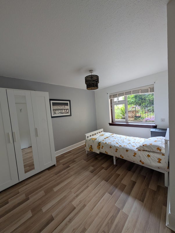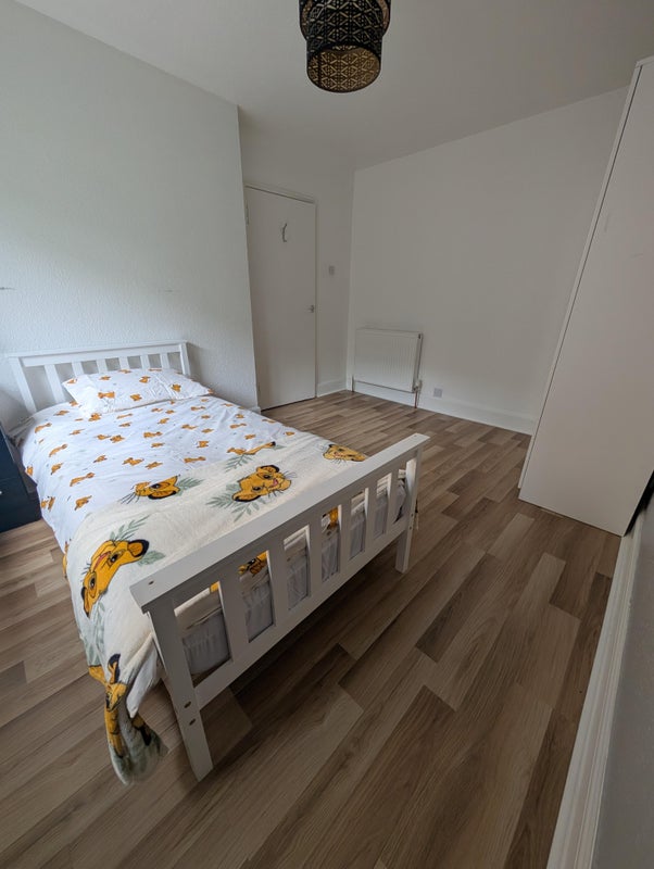 2 bed rooms, one available room to rent. It already has a single bed and a wardrobe. It has a shared living room, bathroom and kitchen.