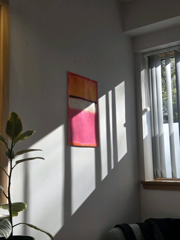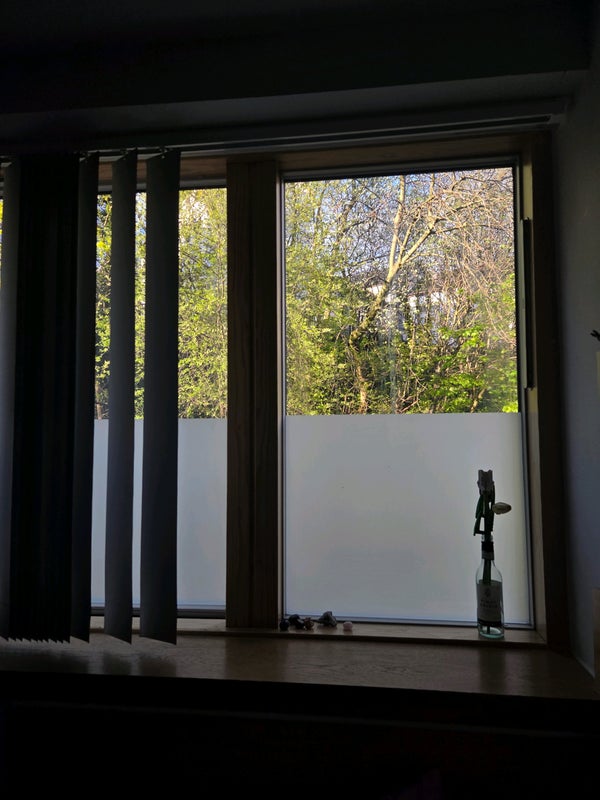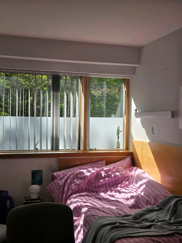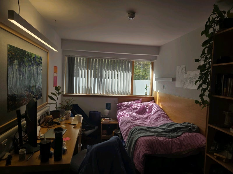 The room is on the ground floor but there is a significant height difference (window starts at around 2.5m from the ground ). It is south facing so it gets lovely light and there is a girls bathroom and boys bathroom each shared by 3 people.