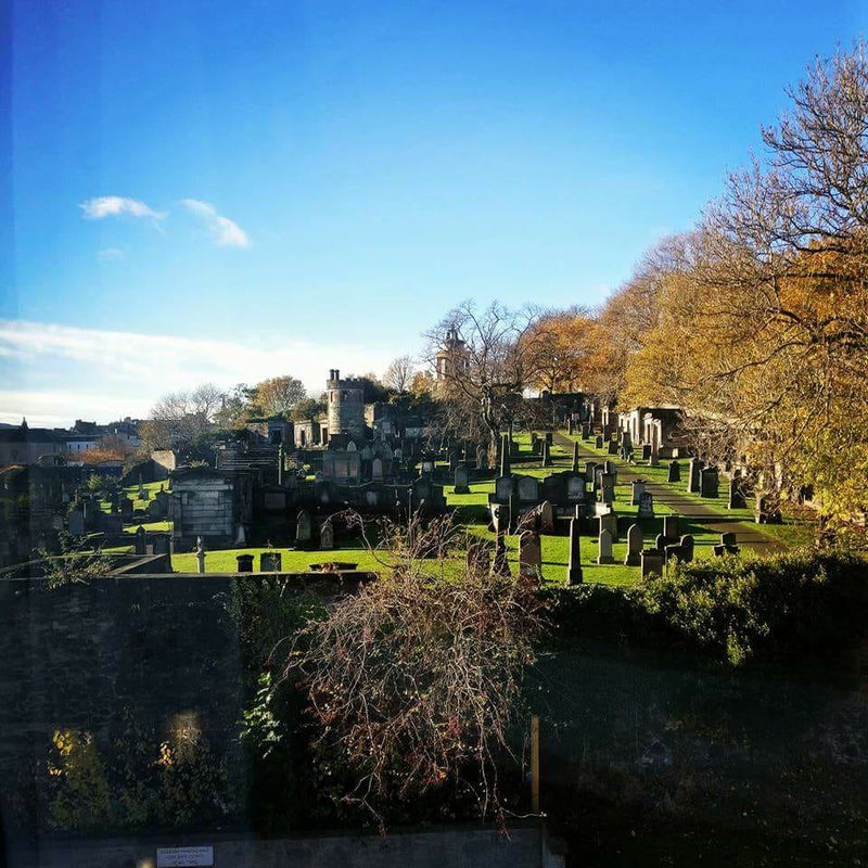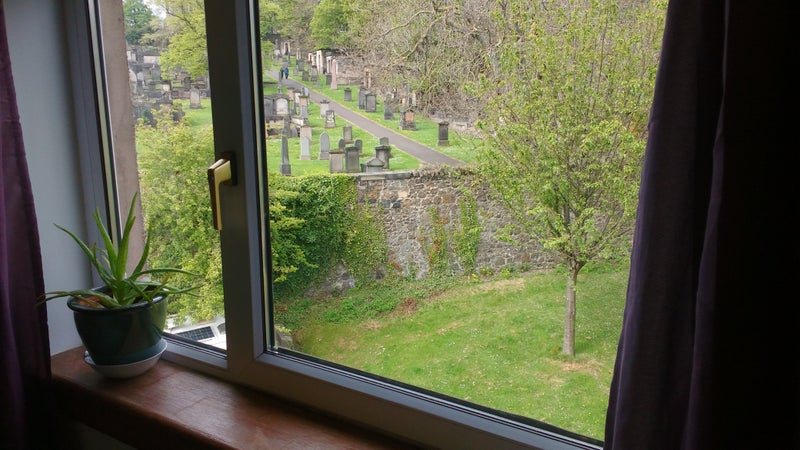 Practicalities: The room has a double bed, a desk and plenty of storage space. The view is to Calton Burial Ground, one of Edinburgh's famous graveyards. There is also a (shared) back garden that looks glorious when the trees are in bloom in the spring.