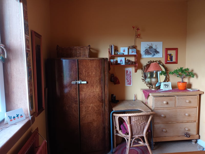 The bedrooom has a queensize bed, single wardrobe, bedside drawers, old-pine chest of drawers and a small desk. The flat is in East Edinburgh - it's on the first floor of a 1930s (6-flats) tenement building.