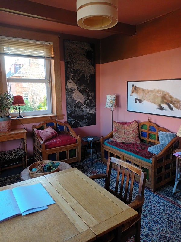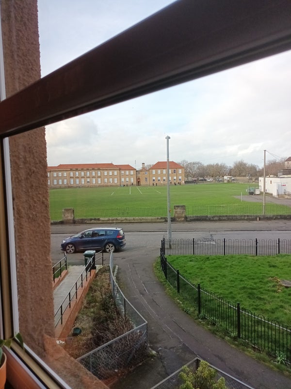 Colourful, clean and comfortable queensize bed / bedroom in East Edinburgh flat with open views across playing field to the local primary school.