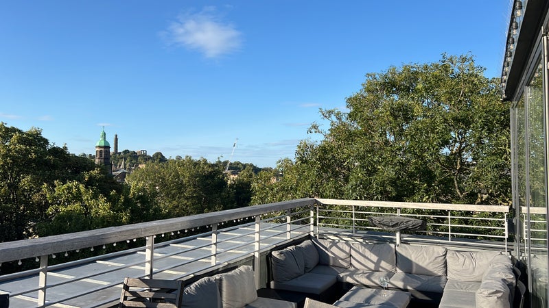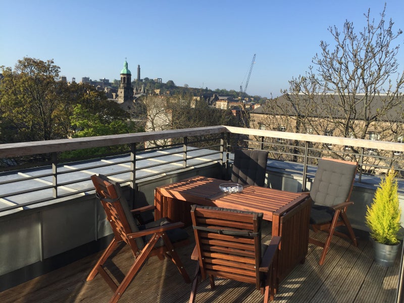 Sliding glass doors lead to a fantastic roof terrace with panoramic views of Royal Mile and the Old Town. This is a great space for BBQ's and evening parties, complete with comfortable stylish outdoor furniture.