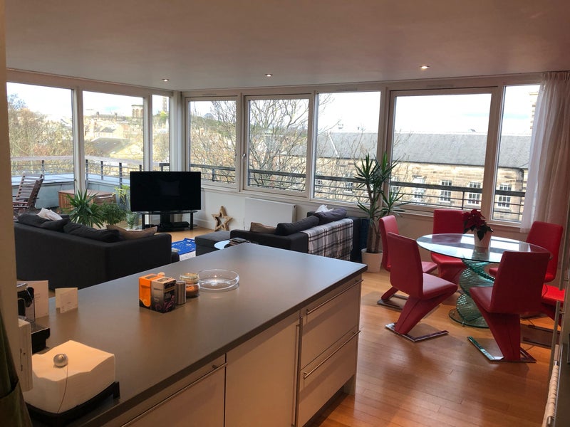 The apartment is very secure and has lift access. Front door opens onto a large hallway with bedrooms and the main bathroom. Feature floating staircase with skylight overhead leads to an open plan entertaining living space, with full length windows looking out to Calton Hill and Arthur Seat.