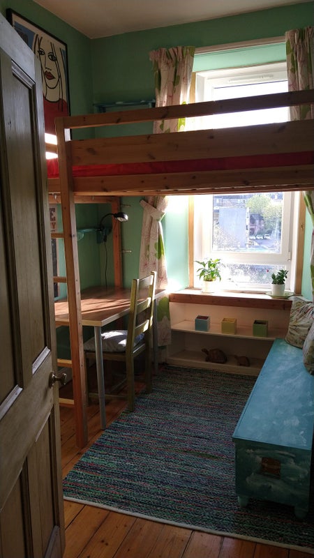 Double room in Edinburgh, in Leith Links. The flat is shared with the owner/ landlord. Bills included. The flat is clean , tidy, and with nice furniture and decoration. The flat is also a suntrap! The room has a double high bed, and a desk, and wardrobe. The flat is on a top floor with excellent open views of Edinburgh's landmarks , cozzy, warm and sunny as it all faces south.