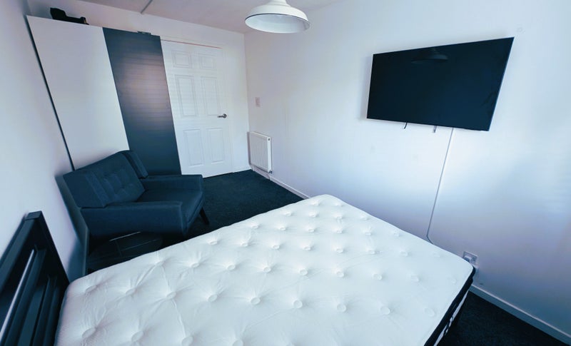 Large size bedroom with double bed, wardrobe, tv and chair. All new. The room has a key door lock. All bills included.