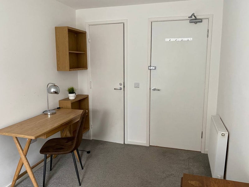 - Double bed, desk, chest of drawers, wardrobe, shelving